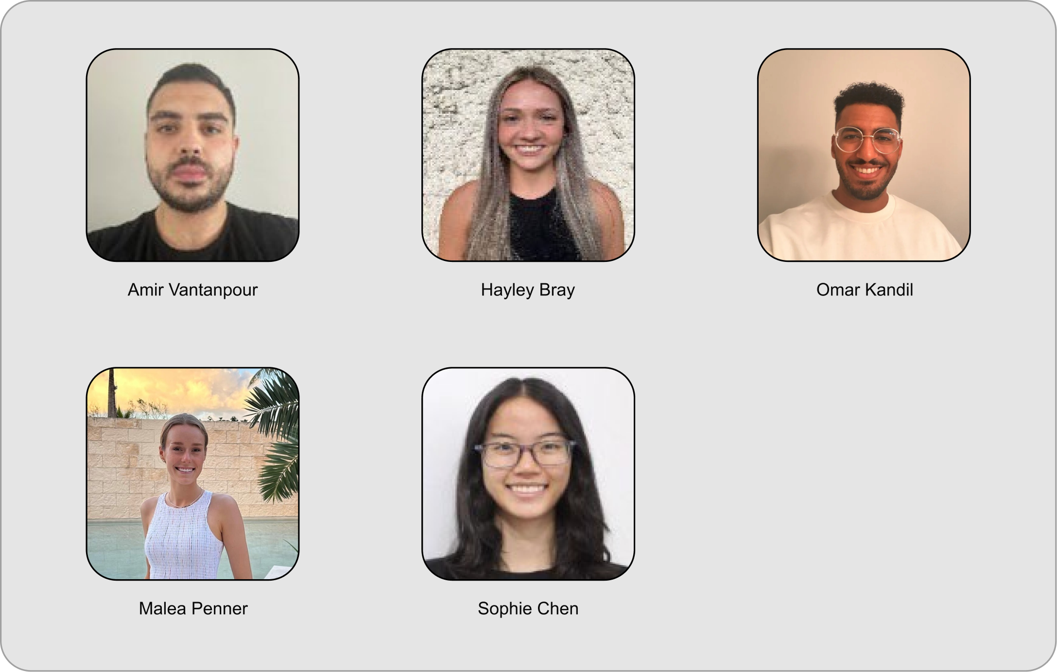 From top row, left to right: Karm Bath, Noah Corso, Israa Elgazzar, Ji Jun Han, Natasha Holder, Stella Korowski, Catherine Long, Dmitry Mikhlin, Tatianan Pribytkova, Paul Ricard, Natalie Rosenthal, Nader Shaker, Harry Singh, Shelly Tang, Allison Torbiak, Jeanne Trinh
